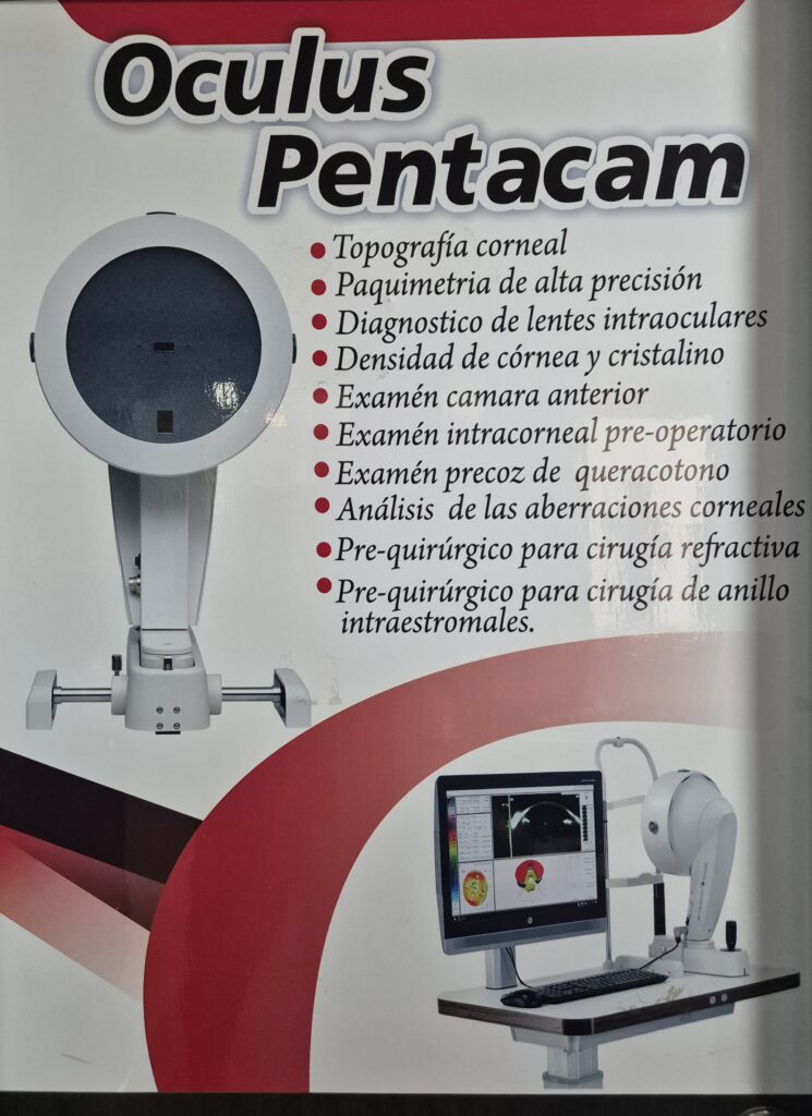 TOPOGRAFIA (PENTACAM): Proporciona un análisis detallado de la forma y la curvatura de la córnea, así como información sobre el espesor corneal, útil para la evaluación previa a la cirugía refractiva y el diagnóstico de queratocono.